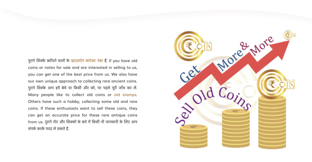 We are old coin buyers and seller. पुराने सिक्के खरीदने व बेचने के लिए आप हमें संपर्क करें। याद रखें कि यहां सभी प्रकार के पुराने सिक्के, नोट और पुरानी मुद्राएं उचित मूल्य पर खरीदी जाती हैं। Most of the old coins or “Purane Sikke” are valuable primarily for their precious metal content. For example, gold and silver coins from the past may have significant intrinsic value due to the metal they contain. Old coin buyers mobile contact number (+91 7700856208) या WhatsApp numbers 7700856208 को बेचने के लिए संपर्क करें। आपके पास जो भी पुराना या डाक टिकट है, आप उसकी एक तस्वीर ले सकते हैं और हमें व्हाट्सएप के माध्यम से भेज सकते हैं। Contact for old coins sell or buy at our WhatsApp or contact numbers.